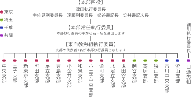 現在は東京の12職場、埼玉の4職場、千葉の2職場に支部があります。同一職場に複数の組合員がいれば“支部”となります。それぞれの支部については左サイドメニュー